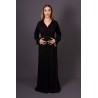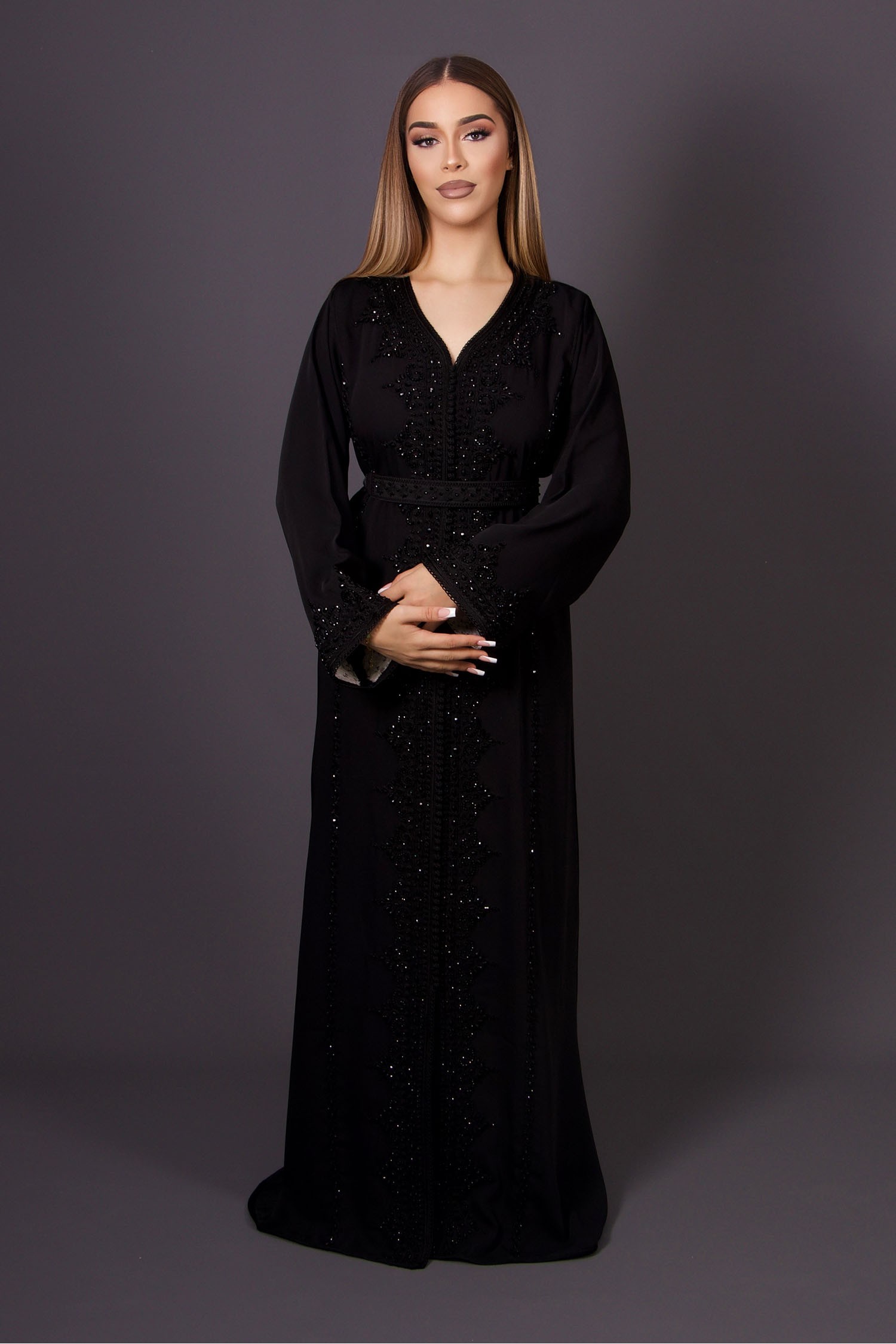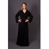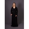 Ce caftan noir incarne une sophistication intemporelle. Réalisé en crêpe de qualité supérieure, il est sublimé par un délicat travail de broderie ton sur ton, rehaussé de perles appliquées à la main, témoignant de l’excellence de l’artisanat marocain.